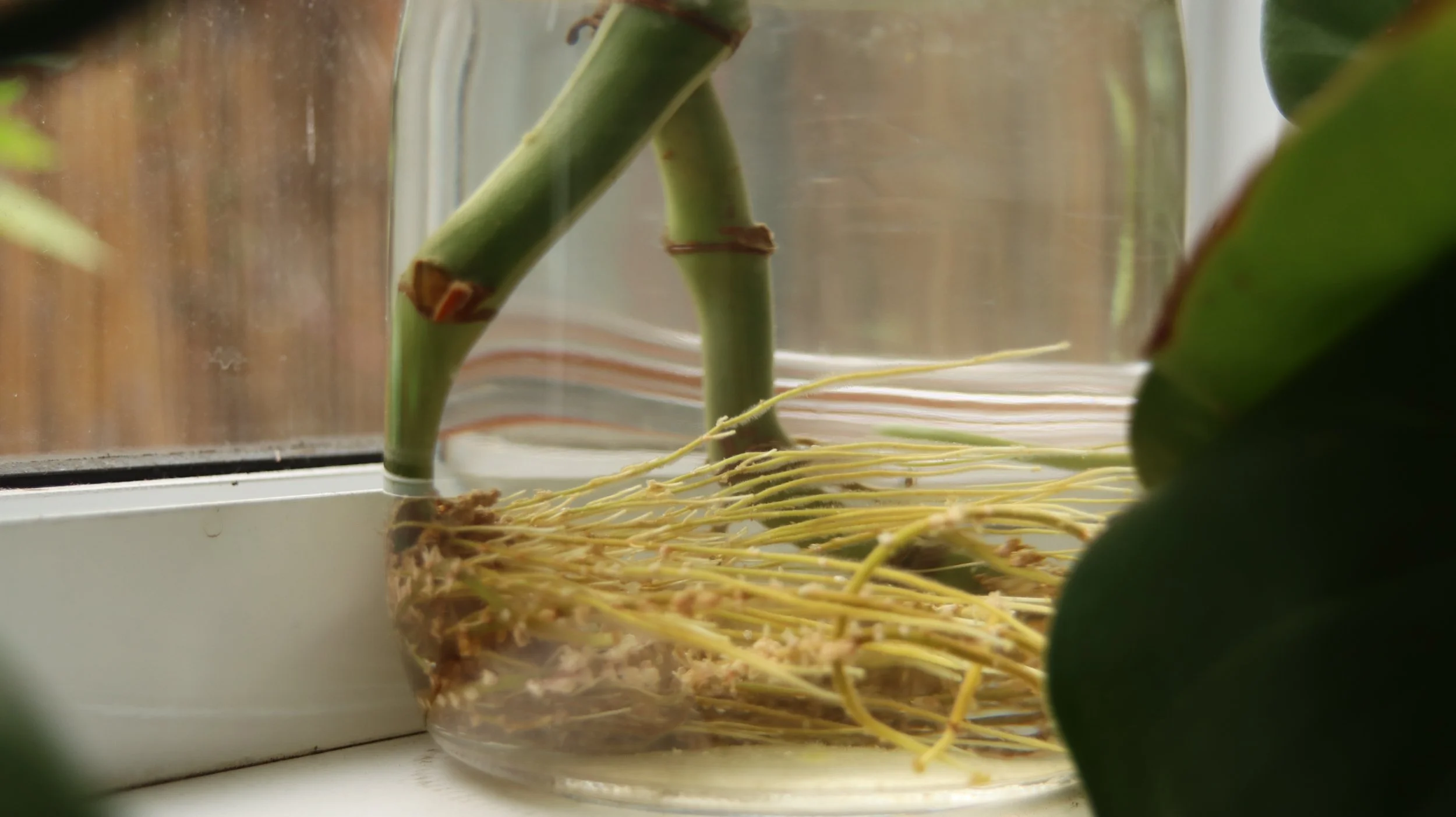 Once you see prominent roots, remove the rooted cutting from the water and give it a good rinse with fresh water.